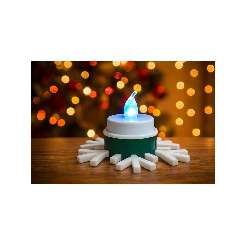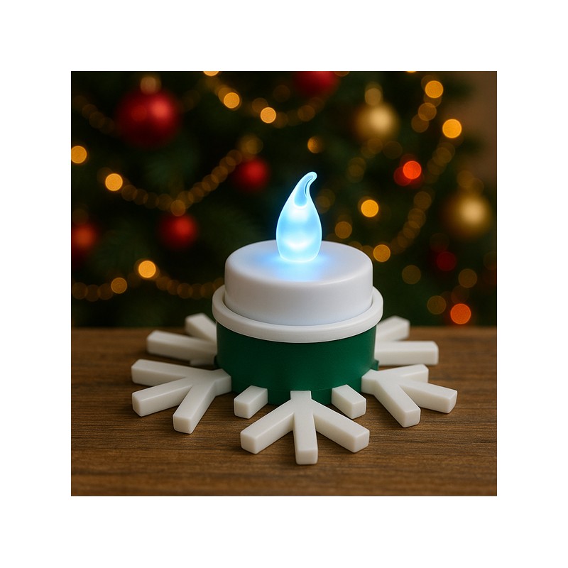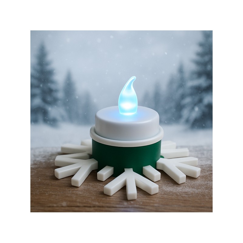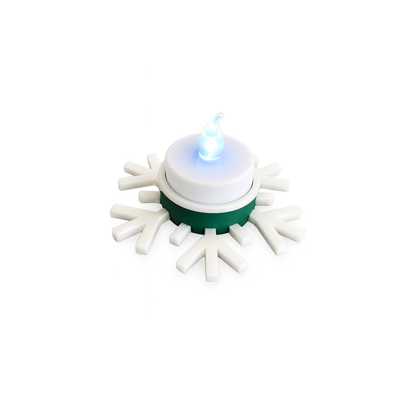 Design : flocon blanc + socle vert sapin avec rebord qui rappelle la neige, pour mettre la bougie LED
